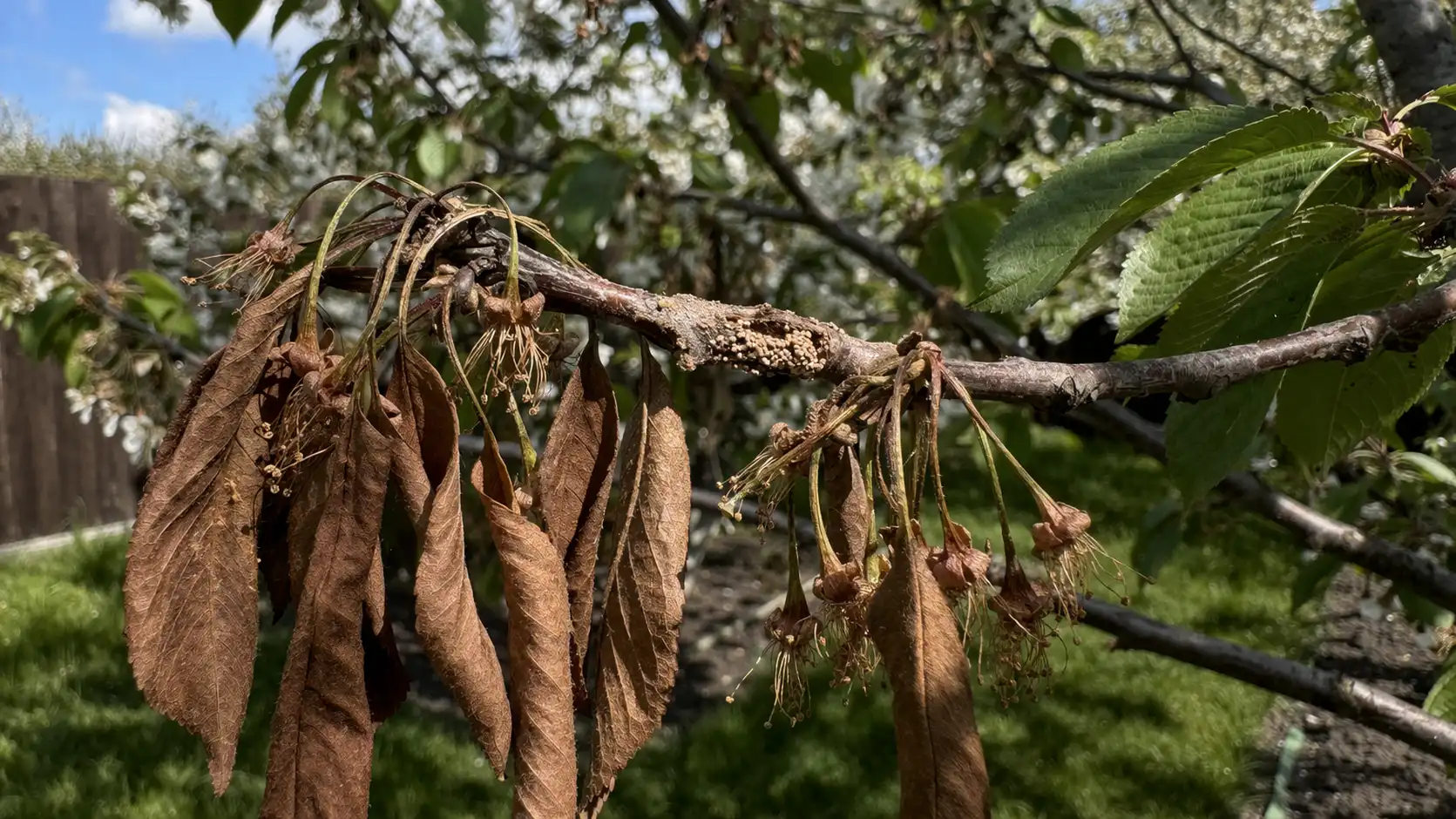 Uzrok katastrofe je visoka vlažnost tijekom cvatnje. Spora gljive slijeće na tučak, raste unutar drva i začepljuje krvne žile, lišavajući granu prehrane.