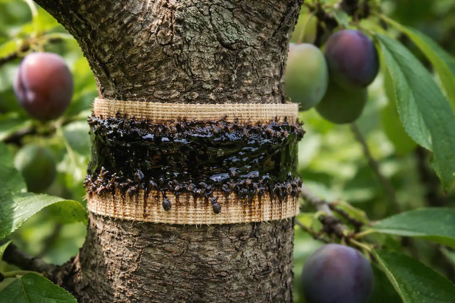 Za izradu pojasa omotajte komad krpe širine 15 centimetara oko debla šljive u visini koljena. Krpu natopite čistim katranom, pazeći da ne dođe na samu koru (u koncentriranom obliku može izazvati opekline na mladim stablima).